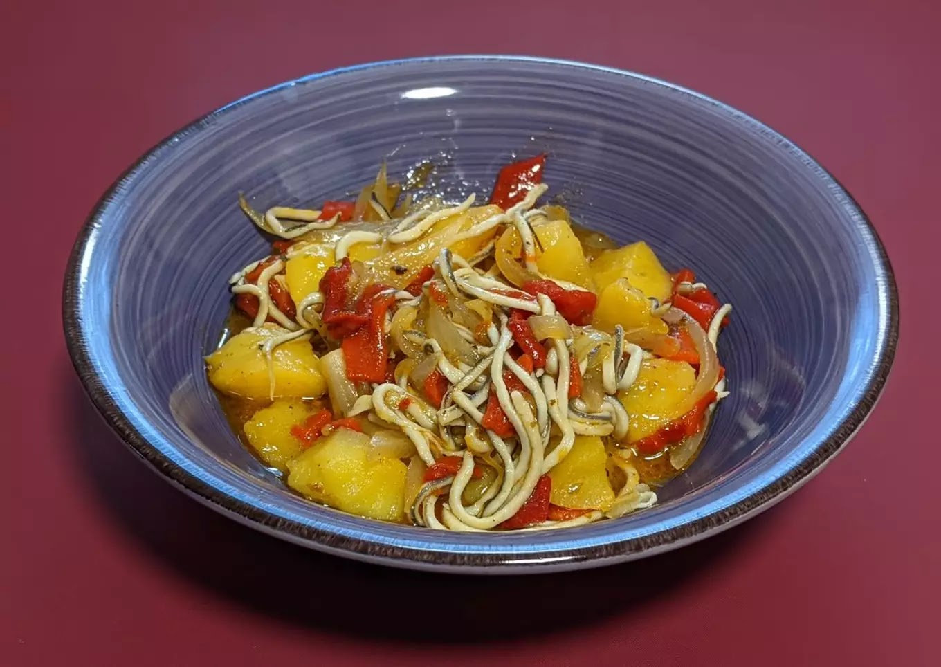 Mientras se va rehogando, pelamos un par de patatas y las vamos chascando en pedazos medianos.